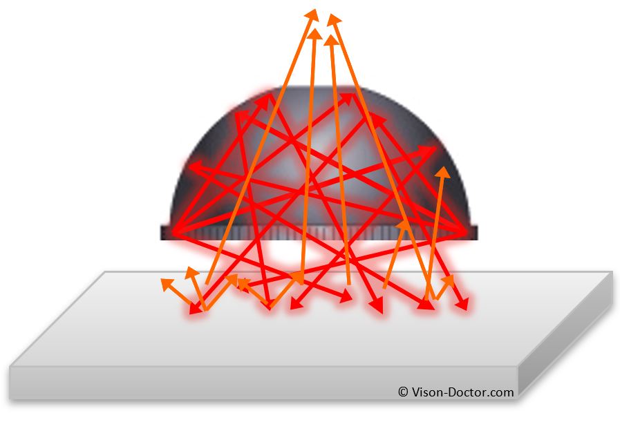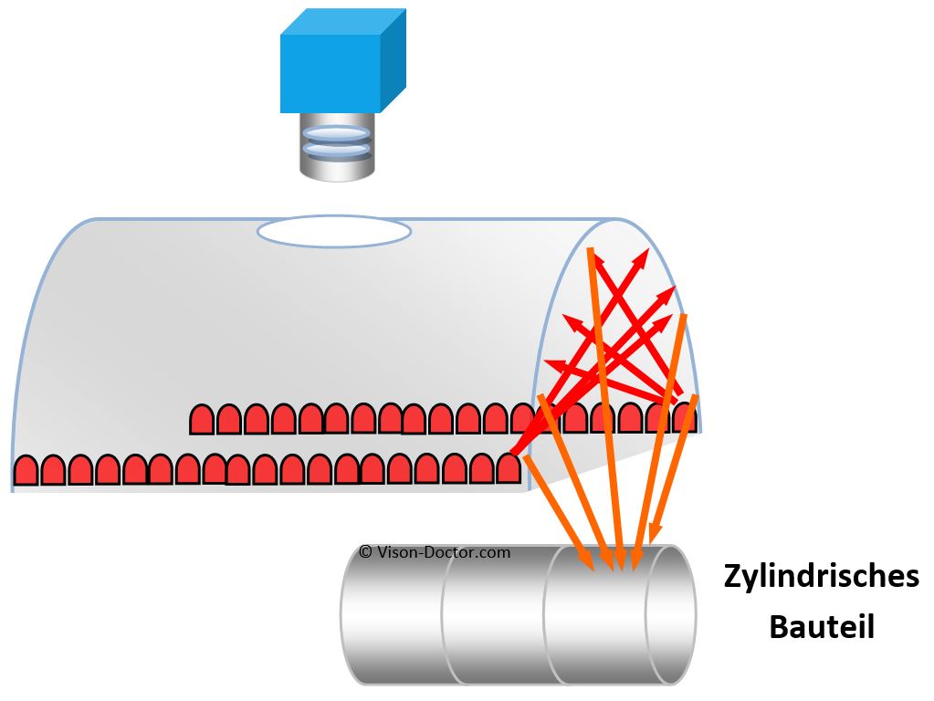Erst eine Dom-Beleuchtung ist in der Lage, wirklich diffuses Licht zu erzeugen, bei dem weitestgehend keine Reflexionen am Bauteil auftreten. Durch den homogenen Lichteinfall aus allen Raumrichtungen werden auch Unebenheiten und Kratzer sehr weich ausgeleuchtet, einheitliches Material wirkt homogen.