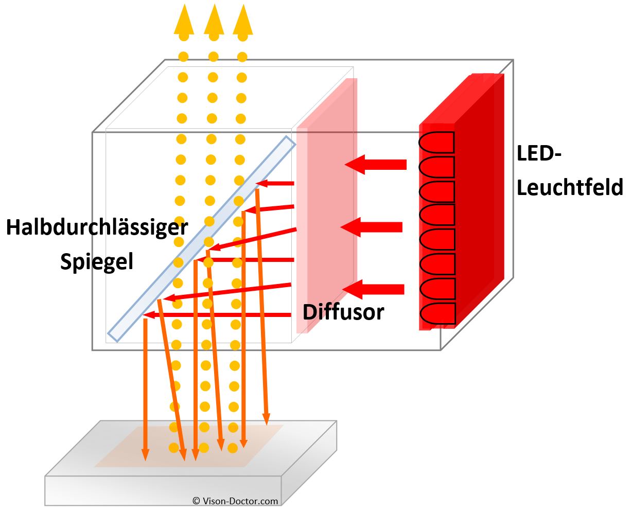 Bei dieser Beleuchtungsart wird das Licht von der Seite (koaxial) in den optischen Strahlengang eingekoppelt. Dies geschieht mit Hilfe eines halbdurchlässigen Spiegels, der seitlich beleuchtet wird und das Licht nach unten auf den Prüfling wirft. Der Prüfling reflektiert das Licht, das durch den halbdurchlässigen Spiegel zur Kamera gelangt.