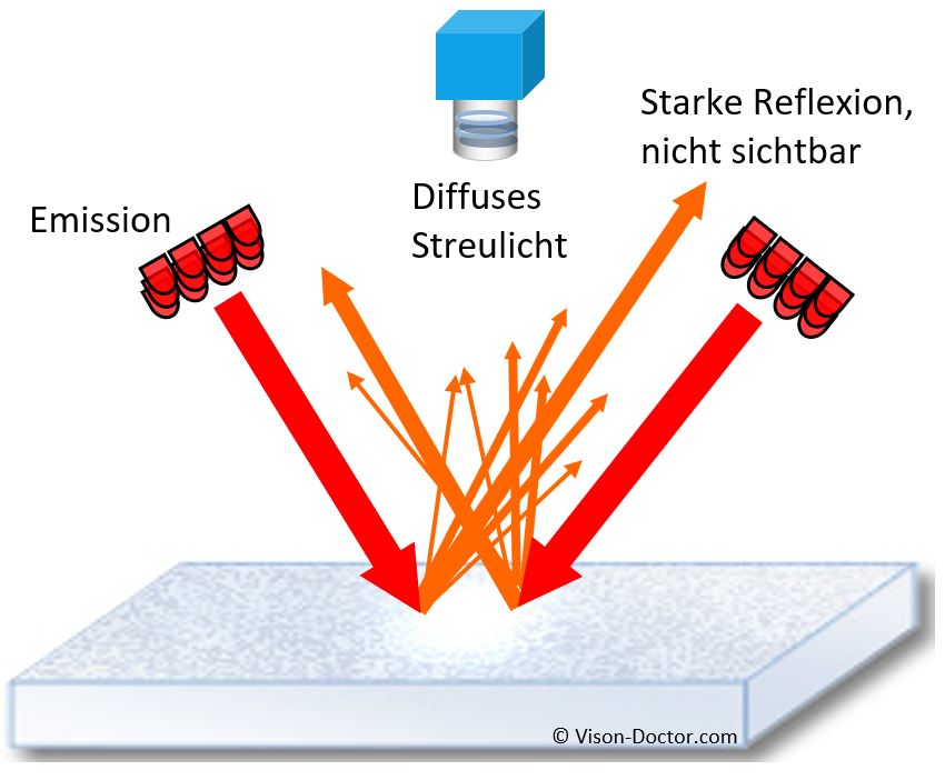 Ab einem Beleuchtungswinkel von etwa 45 Grad spricht man von Dunkelfeld-Beleuchtung. Das Licht an der Oberfläche wird wegreflektiert, das Bildfeld erscheint dunkel. Dieser Effekt ist am stärksten, wenn das Licht extrem flach einfällt, da dann auch kein Streulicht mehr zur Kamera gelangt. Mehr dazu in diesem speziellen Kapitel.