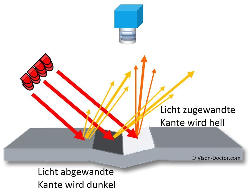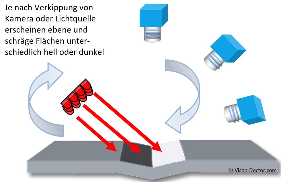 Dies ist ganz einfach zu testen: Nehmen Sie einfach eine nicht zu großflächig abstrahlende Beleuchtung und führen diese von senkrechter Stellung bis in eine seitliche Position und beobachten das Kamerabild des angestrahlten Objekts! Vergleichbare Effekte erhalten Sie auch durch Verkippung der Kamera-Achse zur Bauteiloberfläche bei konstanter Beleuchtungs-Richtung.
