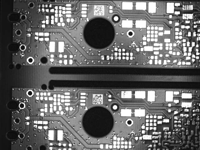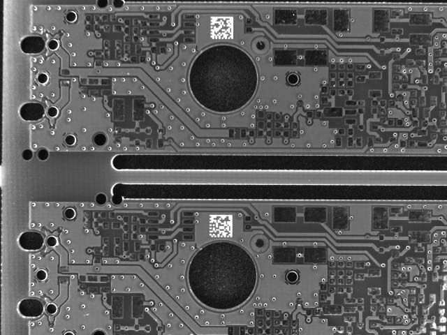 Alle metallischen Leiterbahnen sowie der gelaserte DMC-Code auf der Leiterplatte reflektieren das Licht stark.