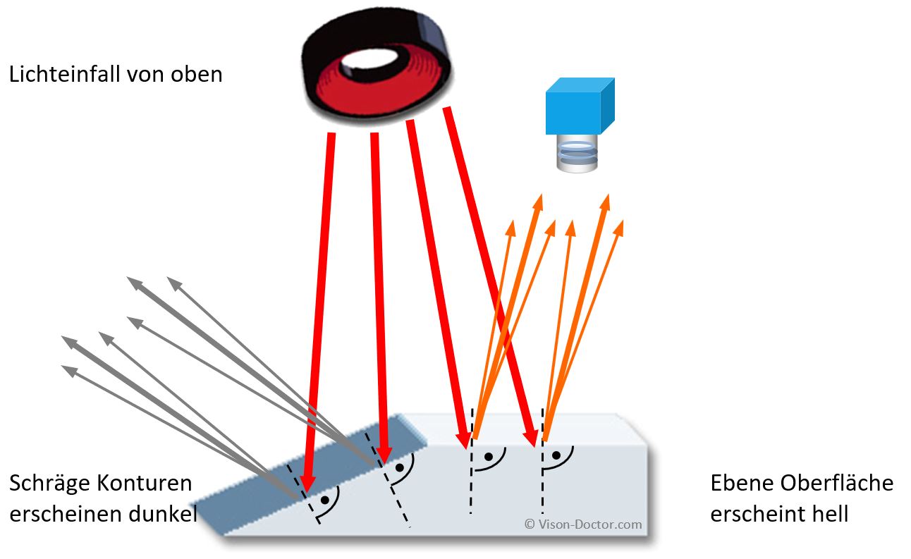Bei gerichteter Beleuchtung von oben entsteht auf der glatten Oberfläche ein starker Lichtreflex. Das Licht wird überwiegend reflektiert. Bei punktförmiger Beleuchtung ist der Einfallswinkel gleich dem Ausfallswinkel. Bei einer direkt gerichteten Auflicht-Beleuchtung, z. B. einem LED-Ringlicht, ist der Raumwinkel, den das Licht ausleuchten kann, sehr klein. Der Abstrahlwinkel von LEDs beträgt typischerweise 15 Grad, wobei die Helligkeitsverteilung über diesen Winkel nicht konstant ist, so dass die abgestrahlte Lichtverteilung in Wirklichkeit viel gerichteter erscheint.