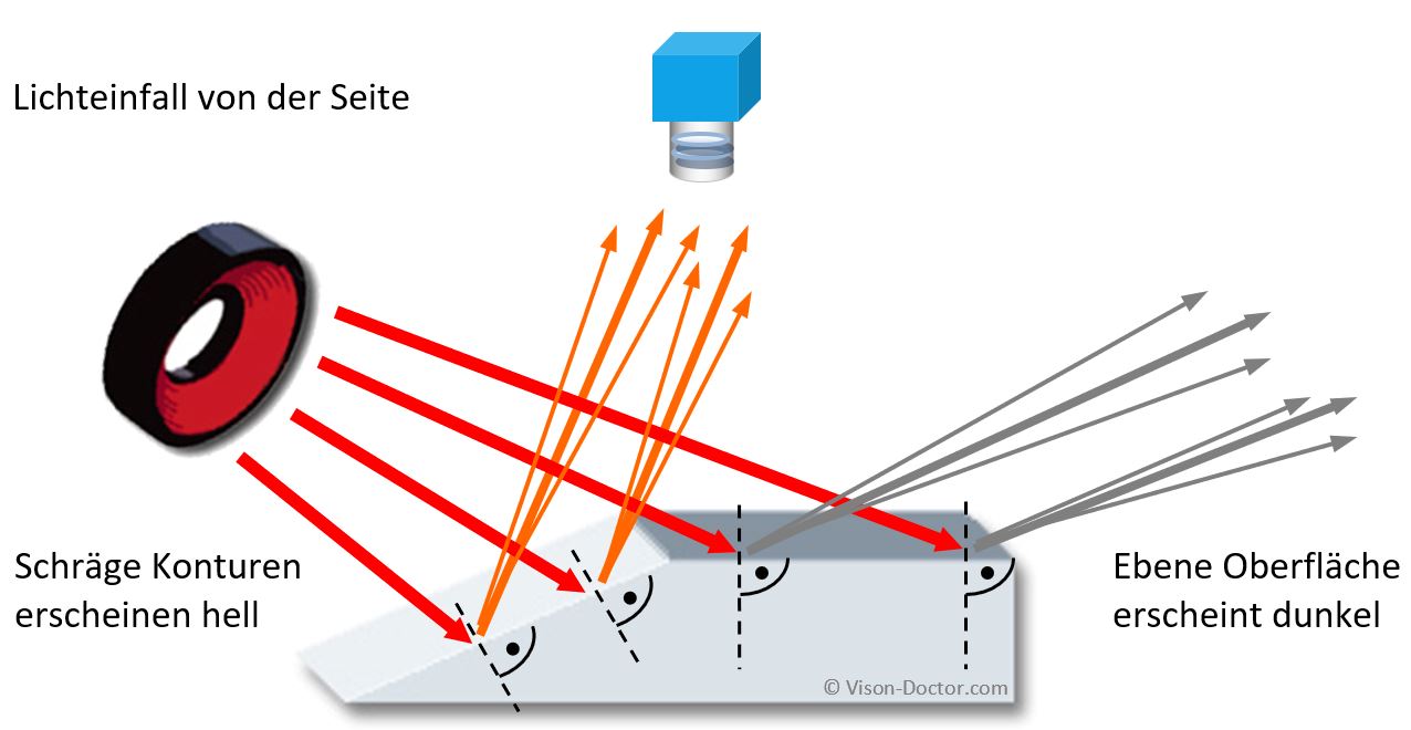 Bei seitlichem Lichteinfall wird auf der ebenen Fläche des Prüfobjekts das Licht zur Seite hin reflektiert und fällt nicht auf den Kamerasensor.