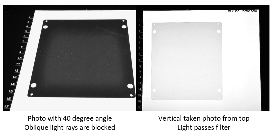 As mainly vertical rays are passed through the filter, no light can reach the camera at angles: the filter appears almost black: