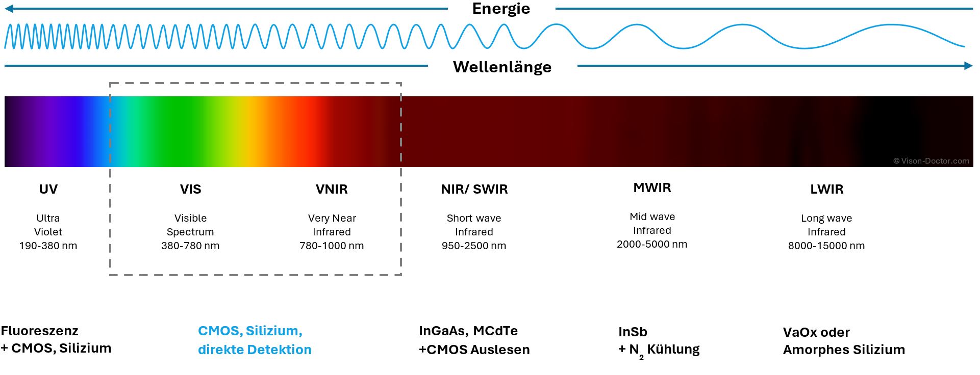 Mit modernen, konventionellen CMOS-Sensoren kann traditionell im sichtbaren Spektrum (VIS) zwischen 400 und 700 nm inspiziert werden. Monochrome Kamerasensoren liefern Intensitätsdaten (meistens 8 Bit, bis 12 Bit bei ungekühlten Standard-Kameras).