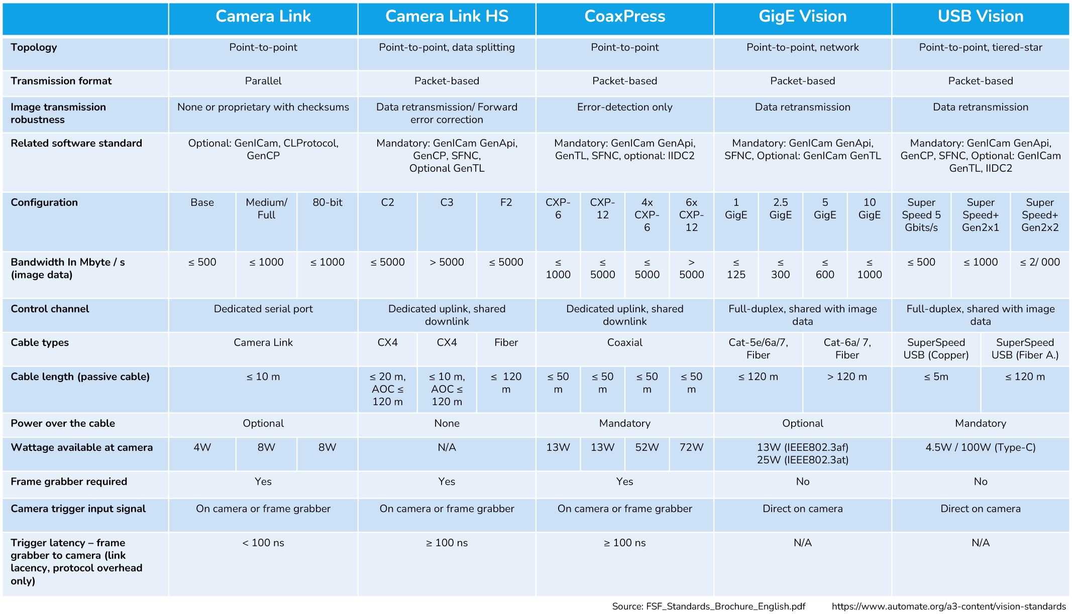 Die meisten Industrieschnittstellen wurden in den letzten Jahren von den internationalen Bildverarbeitungsverbänden in Europa, Amerika und Asien weiterentwicklet und standardisiert. Weitere Details zu den Schnittstellen finden Sie beim amerikanischen A3-Verband: