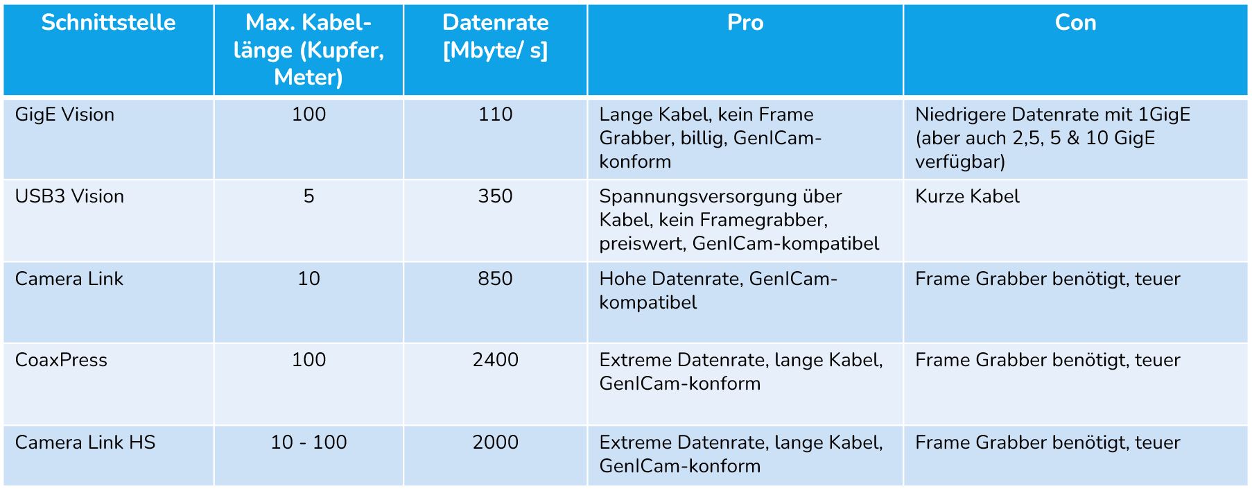 Die Wahl der richtigen Übertragungsschnittstelle für industrielle Kameras hängt von den spezifischen Anforderungen der Anwendung ab. Faktoren wie Datenrate, Reichweite, Latenz und Kosten müssen sorgfältig abgewogen werden, um die bestmögliche Leistung und Effizienz zu gewährleisten.