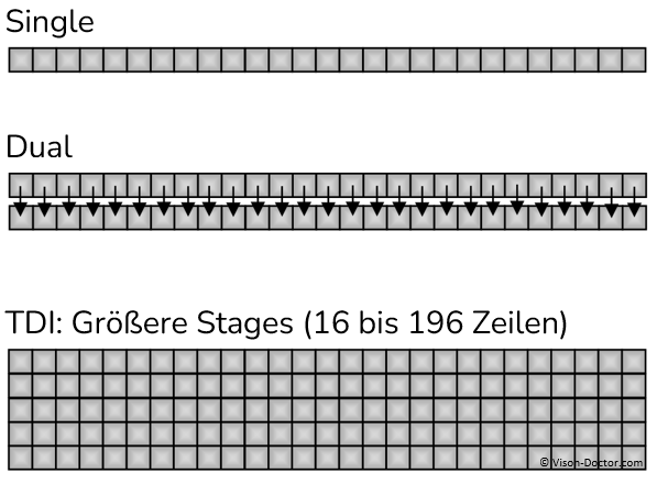 Bei TDI-Zeilenkameras (Time delay integration) werden die Zeilen nicht mehr einzeln belichtet, sondern in größeren Blöcken (Stages), die das Objekt während der Belichtung durchläuft. Die Stages werden jedoch nicht als einzelne Zeilen getriggert, sondern als gesamter Bildblock aufgenommen. Daher ist es unbedingt erforderlich, dass die Objektbewegung und die Integration der Stages auf dem Sensor absolut synchron erfolgen. Dies funktioniert zwar nur bei flachen Objekten, nimmt das Objekt dann aber auch aus verschiedenen optischen Perspektiven auf, so dass Reflexionen auf dem Objekt ausgemittelt werden. TDI-Sensoren sind um ein Vielfaches lichtempfindlicher als Single- oder Dual-Line-Sensoren.