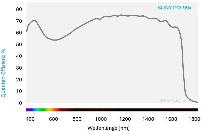Ein weiterer Vorteil der CMOS-Technologie ist die Fähigkeit der Monochrom-Varianten, im Spektralbereich bis zu 1000 nm (VNIR = "Very Near Infrared") ohne besondere Modifikationen eingesetzt zu werden. Dies eröffnet zusätzliche Anwendungsmöglichkeiten in der industriellen Inspektion und der Landwirtschaft, wo Nahinfrarotlicht genutzt wird, um Materialeigenschaften wie Feuchtigkeit und Zusammensetzung zu analysieren.