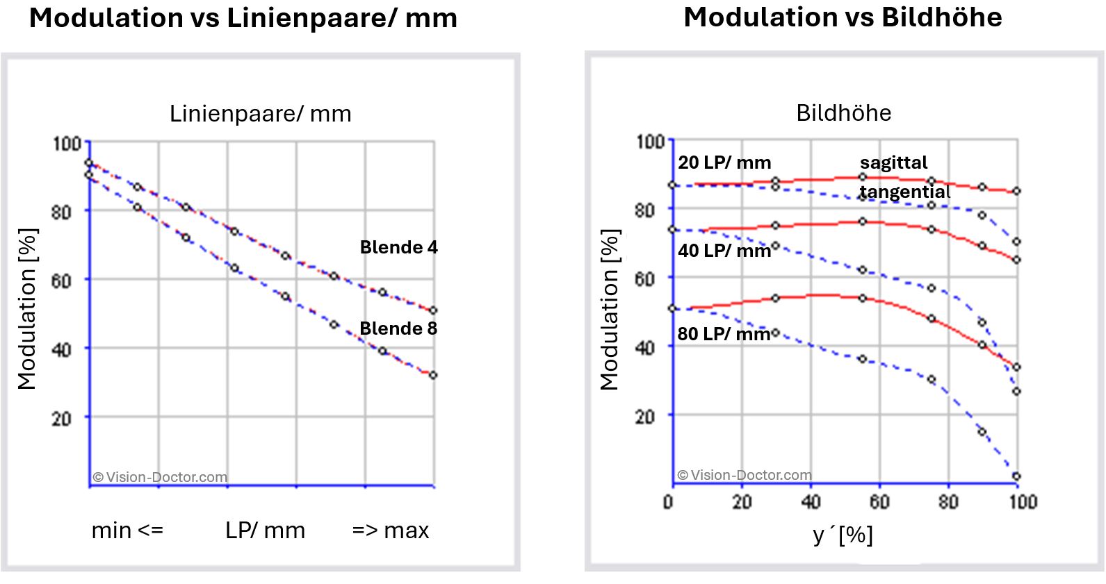 Zur Beurteilung des Auflösungsvermögens der Optik wird in erster Linie die Modulationstransferfunktion (MTF) hinzugezogen. Diese vom Hersteller erhältlichen Diagramme treffen eine Aussage darüber, wie viele nebeneinander liegende schwarzweiße Linienpaare mit welchem Kontrast noch differenziert abgebildet werden – das heißt, je mehr Linienpaare bei möglichst hohem Kontrast, desto besser ist das Objektiv.