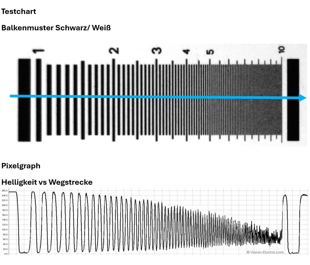 Für den Bildverarbeiter ist es von Interesse, Objekte mit möglichst hoher Auflösung (Bildschärfe, Detailreichtum) und mit möglichst hohem Kontrast abzubilden. Das Bild sollte dabei grobe wie feine Objektstrukturen in allen Bereichen des Bildes wirklichkeitsgetreu darstellen. Dieser theoretische Wunschgedanke ist leider in der Praxis nicht perfekt umsetzbar. Es zeigt sich, dass besonders bei feinen Objektstrukturen Kontrastverschlechterungen auftreten, so dass ab einer gewissen Feinheit die Merkmale nicht mehr von der Software auswertbar sind. Diese Verschlechterung der Bildqualität nimmt typischerweise zusätzlich von der Bildmitte zum Bildrand zu.